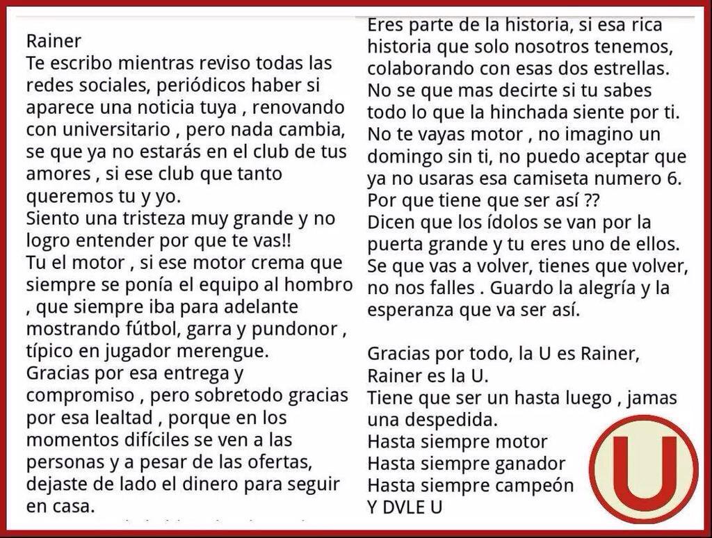 "Rainer, te escribo mientras reviso todas las redes sociales, periódicos, haber (DIXIT) si aparece una noticia tuya renovando con Universitario, pero nada cambia. Sé que ya no estarás en el club de tus amores, sí, ese club que tanto queremos tú y yo".