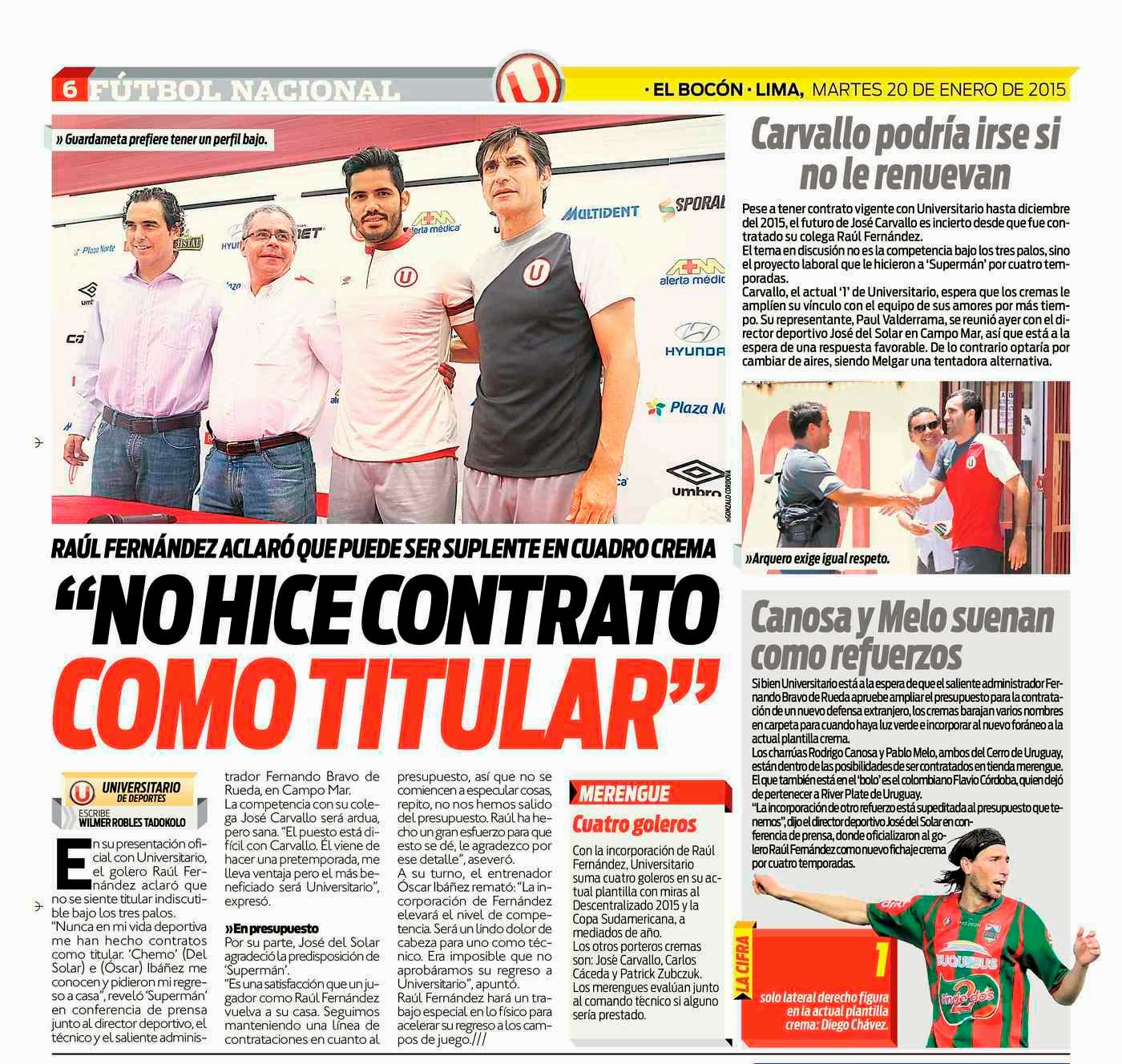 "Su primera sensación fue de incertidumbre. José no entendía qué estaba pasando (con la llegada de Raúl Fernández). José tiene contrato con Universitario de Deportes hasta diciembre 2015", dijo Paul Valderrama, agente de José Carvallo.