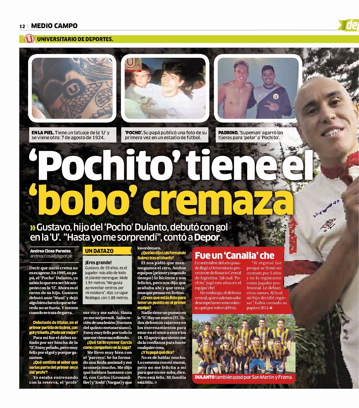 El 18 de abril será una fecha que recordará Gustavo. Y es que ese día el hijo del exjugador crema Alfonso ‘Pocho’ Dulanto marcó su primer gol con la camiseta del club en su partido debut, en el primer equipo. A sus 19 años, el defensa muestra gran madurez y sueña con alcanzar títulos con la institución tal como lo hizo su padre.