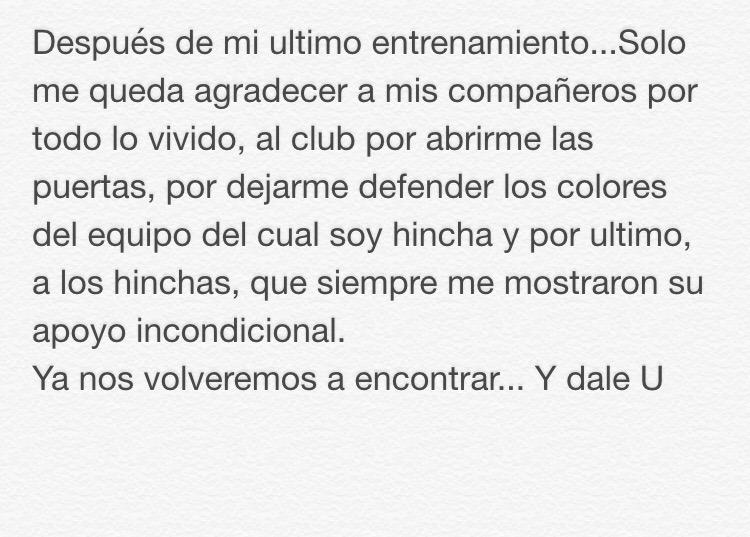 “Después de mi último entrenamientos, solo queda agradecer a mis compañeros por todo lo vivido, al club por abrirme las puertas, por dejarme defender los colores del equipo del cual soy hincha y por último a los hinchas, que siempre me mostraron su apoyo incondicional, ya nos volveremos a encontrar. Y dale U!”, reza el mensaje que publicó en Twiiter.