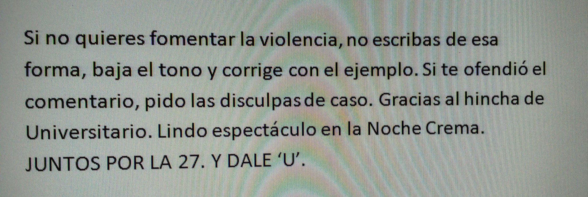 Ante esto, el crema volvió a responderle: “Si no quieres fomentar la violencia, no escribas de esa forma, baja el tono y corrige con el ejemplo. Si te ofendió el comentario, pido las disculpas de caso. Gracias al hincha de Universitario de Deportes. Lindo espectáculo. JUNTOS POR LA 27. Y DALE ‘U’”, escribió Vargas en su cuenta de Twitter.