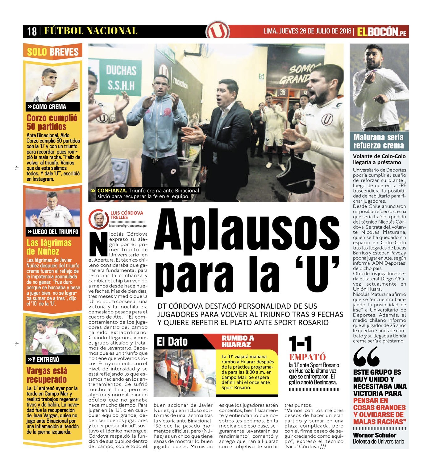 Su nombre volvió a la palestra del festejo y de las portadas que hablan de un triunfo de Universitario. Sin duda, Anthony Osorio, con 20 años en la espalda, fue el personaje de esta historia crema de 9 partidos sin ganar y 16 encuentros sin que un delantero pueda anotar. Vaya que no hay mal que dure cien años, ni cuerpo que lo resista con un golazo que ya quedó en la estadística. Tío, no sabes lo que fue. Es sacarse una gran presión de encima. Una mochila jodida de cargar, que el grupo necesitaba quitarse. Fue una jugada que siempre la practico en los entrenamientos, me salió un golazo. La verdad, tenía ganas de llorar en el festejo, empezó el diálogo con el Oso de Breña, natural de Ica, quien llegó a Lima para hacer feliz al pueblo crema.