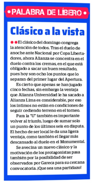 Fuente: https://depor.com/futbol-peruano/descentralizado/universitario-vs-alianza-lima-el-clasico-recibio-las-garantias-y-se-jugara-de-todas-maneras-este-domingo-noticia/