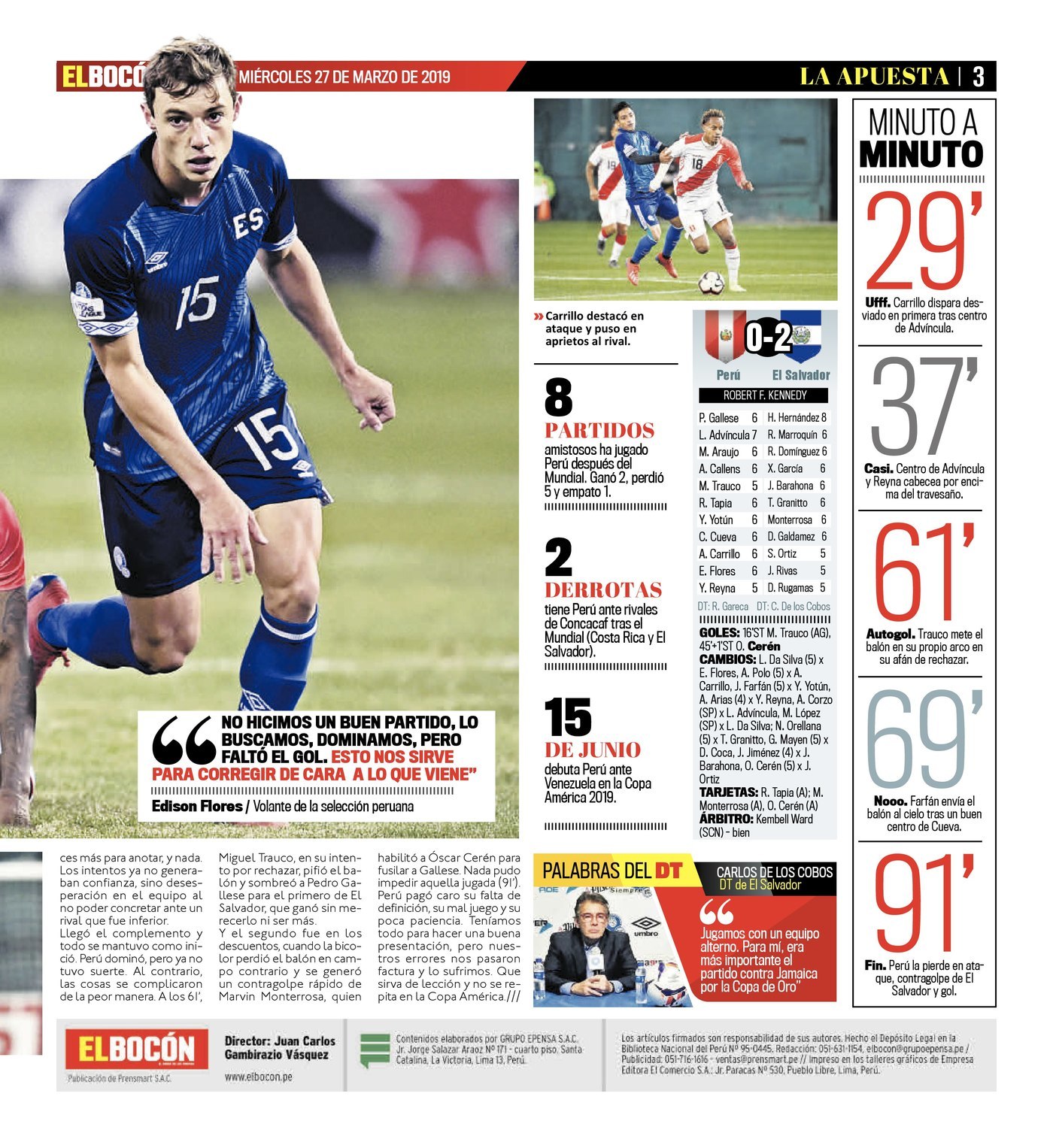 Con el tiempo cumplido y todos entregados en el ataque, se escapó Óscar Cerén y con un potente zurdazo terminó confirmando un triunfo merecido para El Salvador, que deja confundido a Perú en un estadio donde se sintió visitante, pero donde también se olvidó de la mayoría de sus ideas.