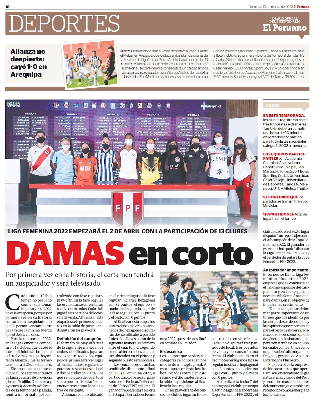 Cada año el fútbol femenino peruano comienza a tomar impulso y este 2022 no es la excepción, porque por primera vez en su historia contará con auspiciador, lo que le permite encaminarse para tener la misma fuerza que el de los varones.